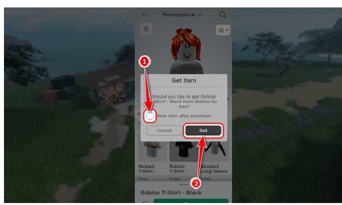 - Bước 4: Bạn Đánh dấu vào tùy chọn Wear item after purchase để áp dụng chiếc áo vào nhân vật. Cuối cùng Bạn nhấn Get để hoàn thành.