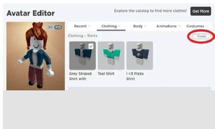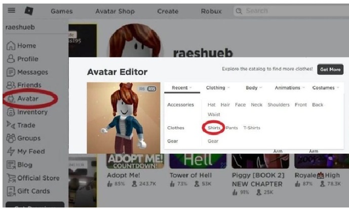 Bước 2: Bạn truy cập vào tài khoản Roblox trên PC và chọn mục Avatar. Bạn Click vào phần Shirts để tải mẫu thiết kế áo thun mà bạn vừa thực hiện.