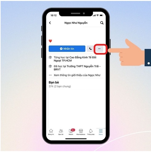 Bước 3: Tại danh sách kết quả vừa được hiển thị ra. Bạn cuộn màn hình xuống để có thể tìm kiếm được. Và chọn vào tên của tài khoản Facebook đó. Bạn thực hiện việc nhấn vào biểu tượng 3 dấu chấm như hình bên dưới: