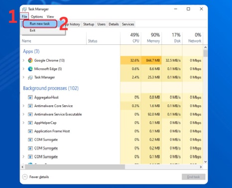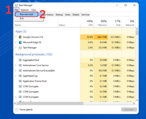 Bước 1: Bạn thực hiện nhấn tổ hợp phím Ctrl + Shift + Esc hoặc là Ctrl + Alt + Delete để thao tác mở Task Manager. Bạn tiến hành chọn File. Rồi thực hiện chọn tiếp Run a new task.