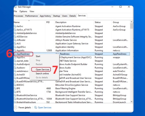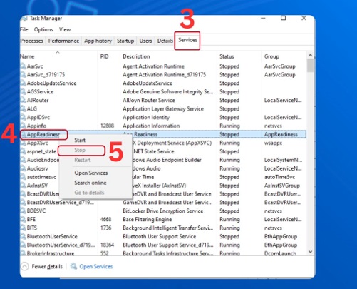 Bước 2: Bạn thực hiện chọn tab Service. Bạn thực hiện nhấp chuột phải vào mục App Readiness. Bạn nhấn chọn Stop.