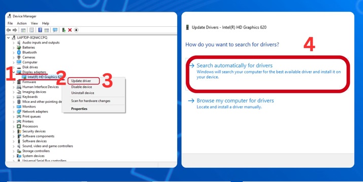 Bước 2: Bạn thực hiện việc chọn Display adapters. Bạn thực hiện việc nhấp chuột phải vào card đồ họa. Bạn thực hiện nhấn chọn Update driver. Bạn thực hiện chọn vào Search automatically for driver.