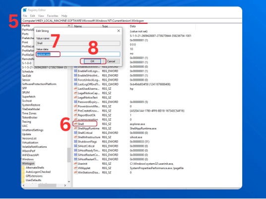 Bước 4: Bạn thực hiện tìm và chọn mục Shell. Rồi thực hiện chỉnh sửa Value Data thành “explorer.exe”.