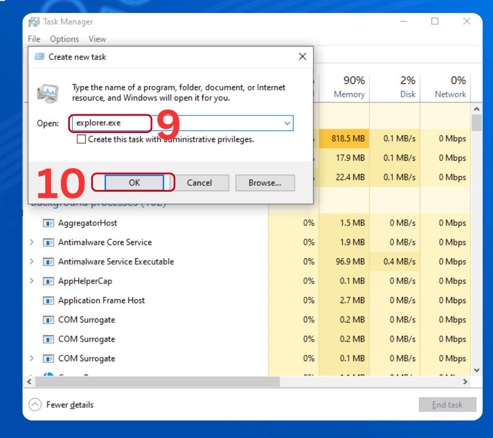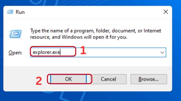 Bước 5: Bạn tiến hành lại các thao tác như bước 1. Sau đó thì thực hiện nhập lệnh explorer.exe. Và bạn chọn OK.