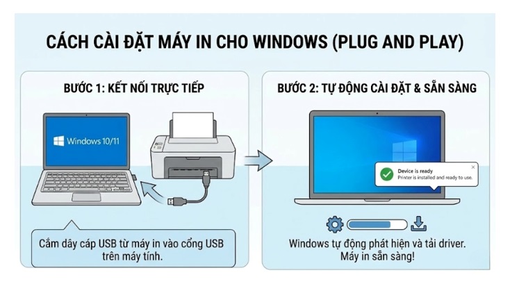 Bạn chỉ cần thực hiện việc cắm dây cáp từ máy in vào cổng USB trên máy tính. Hệ điều hành Windows sẽ thực hiện tự động phát hiện được thiết bị mới và tự động việc tải driver phù hợp để có thể cài đặt.