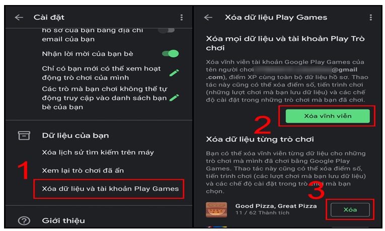 + Bước 2: Bạn bấm vào chọn Xóa dữ liệu và tài khoản Play Games. Bấm vào chọn tiếp Xóa vĩnh viễn (2) để xóa đi mọi dữ liệu và tài khoản ngay tại Play Game hay là chọn tiếp Xóa (3) ở tại trò chơi mà bạn muốn xóa đi dữ liệu game.