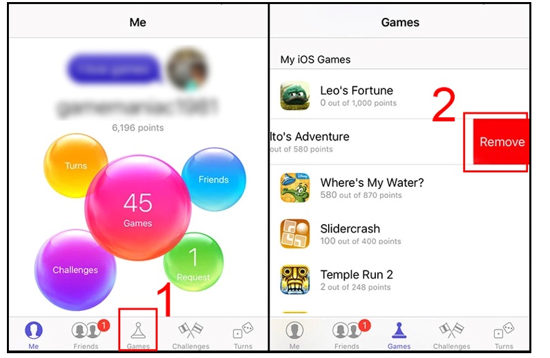 Bạn hãy vào mở ứng dụng Game Center. Hãy bấm chọn Game. Rồi bấm vào chọn tiếp trò chơi muốn xóa dữ liệu. Bấm vào chọn vào Remove.