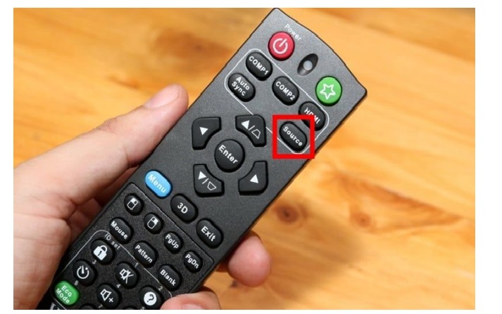 - Bước 1: Bạn hãy nhấn vào nút Source hoặc Input (hay là nút có biểu tượng hình vuông nhiều mũi tên) ở trên điều khiển máy chiếu hay thân máy.