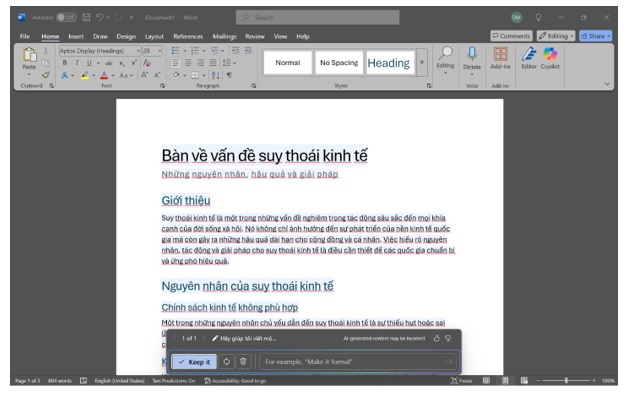 Thay vì bạn phải cặm cụi để đọc một tài liệu để nghiên cứu dài hàng chục trang mới có thể làm báo cáo. Thì bạn chỉ cần thực hiện gõ một dòng lệnh đơn giản là “Tóm tắt tài liệu này thành 5 luận điểm chính”. Ngay lập tức thì Copilot sẽ hoàn thành nhiệm vụ giúp bạn. Hay là khi bạn bị bí ý tưởng cho một bài luận nào đó. Thì bạn có thể yêu cầu: “Viết giúp cho tôi một bài luận về vấn đề bị suy thoái kinh tế”, Copilot sẽ giúp cho bạn viết được bài, lên ý tưởng ngay ở chính trong Word.
