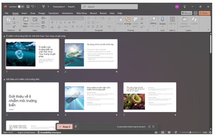 Bạn có một bản Word được chi tiết về các kế hoạch dự án. Nhưng mà bạn không có thời gian để thực hiện thiết kế slide? Thì chỉ cần với một câu lệnh: “Tạo ra một bài thuyết trình có 10 slide chuyên nghiệp từ các nội dung của tài liệu này, với bố cục hiện đại và hình ảnh minh họa phải được phù hợp cho mỗi slide”.