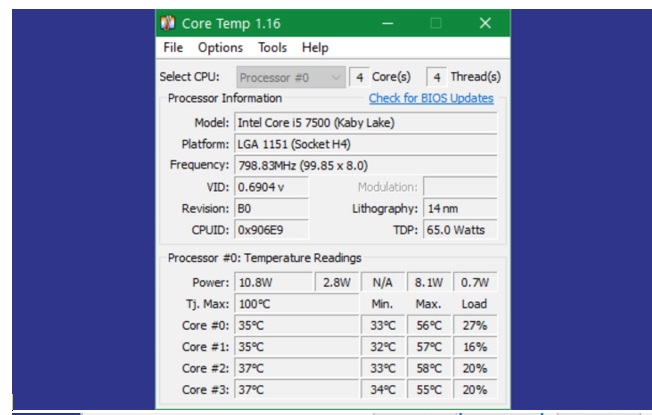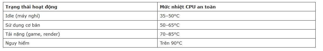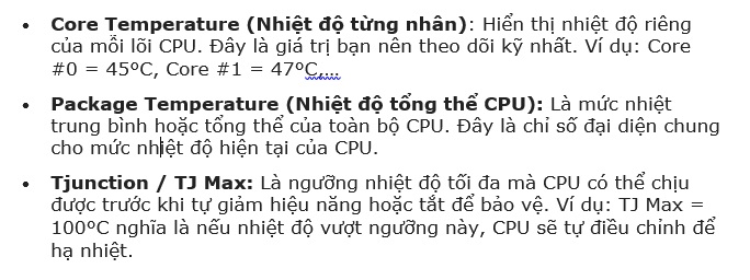 Lưu ý: Nếu là CPU thường xuyên ở trên 85°C thì nên thực hiện kiểm tra quạt tản nhiệt, vệ sinh bụi. Và tiến hành thay keo tản nhiệt. Với loại laptop mỏng nhẹ, nếu nhiệt độ cao hơn mức trung bình ở 5–10°C thì vẫn được coi là chấp nhận được nếu hiệu suất không giảm.
