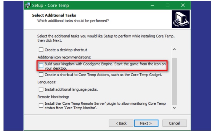 Bạn hãy thực hiện tải Core Temp từ trang chính thức. Khi thực hiện việc cài đặt, bạn nên bỏ đi chọn mục “Build your kingdom with Goodgame Empire” để tránh khỏi phần mềm rác.