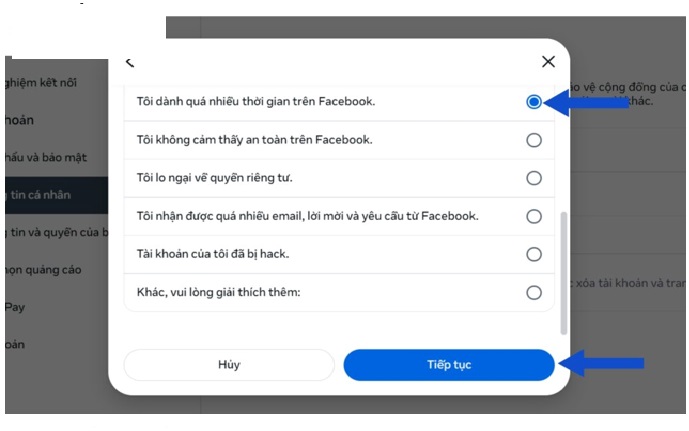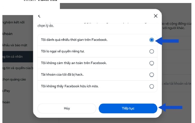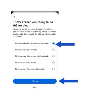- Bước 5: Bạn nhấn Chọn lý do muốn xóa tài khoản. Sau đó bạn nhấn vàoTiếp tục.