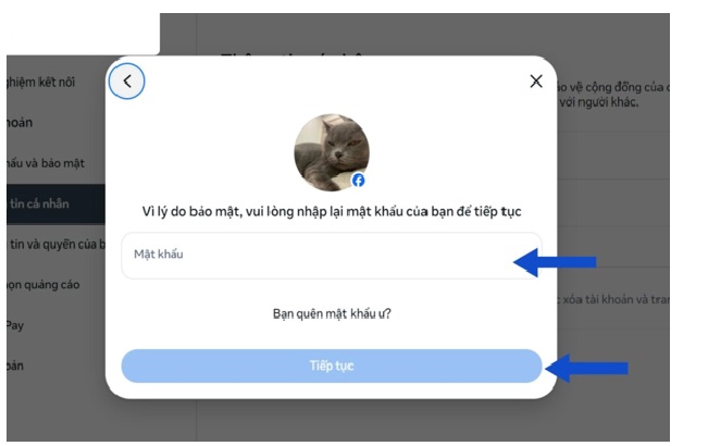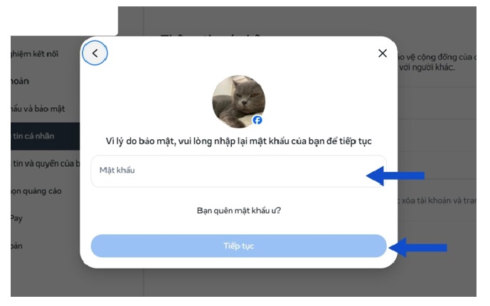 - Bước 5: Bạn Nhập mật khẩu Facebook khi được yêu cầu. Và bạn nhấn Tiếp tục.