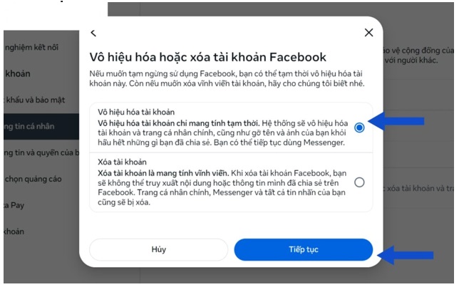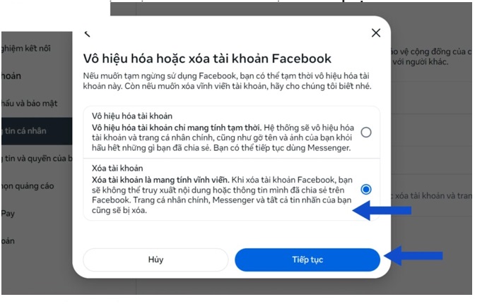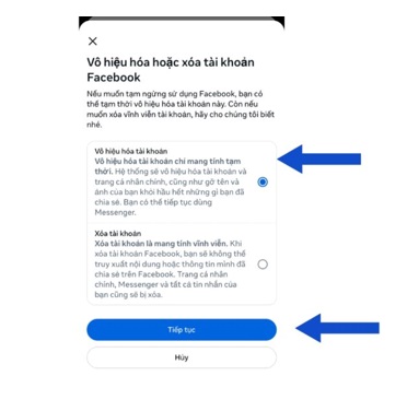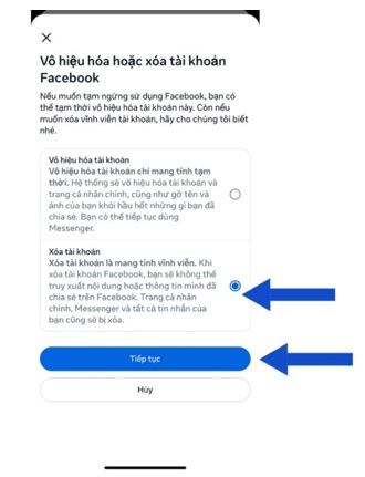 Bước 4: Ở tại đây, bạn sẽ thấy hai tùy chọn là Vô hiệu hóa tài khoản (Tài khoản của bạn sẽ tạm thời bị ẩn, nhưng mà bạn vẫn có thể sử dụng Messenger.) và tùy chọn tiếp theo Xóa tài khoản (Tài khoản bị xóa vĩnh viễn, không thể khôi phục sau thời gian quy định). Bạn Chọn Xóa tài khoản, sau đó bạn nhấn Tiếp tục.