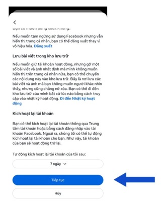 - Bước 6: Bạn Chọn thời gian Facebook tự động kích hoạt lại tài khoản (nếu có). Sau đó Bạn nhấn Tiếp tục và bấm chọn Vô hiệu hóa tài khoản của tôi để hoàn tất.