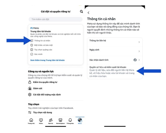 - Bước 2: Bạn bấm chọn vào mục Thông tin cá nhân. Sau đó bạn nhấn vào Quyền sở hữu và kiểm soát tài khoản.