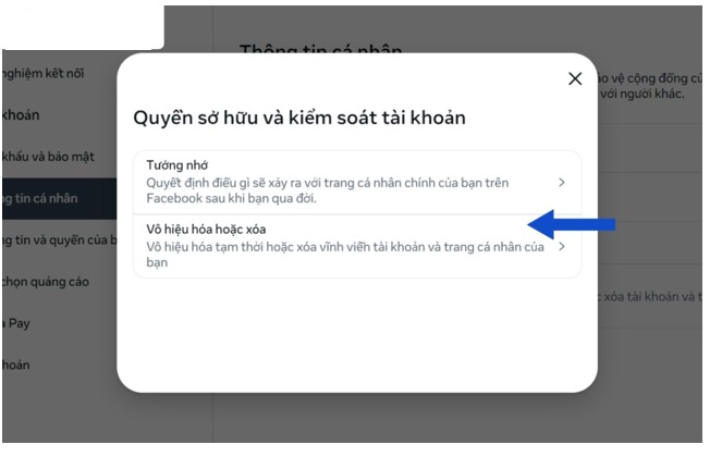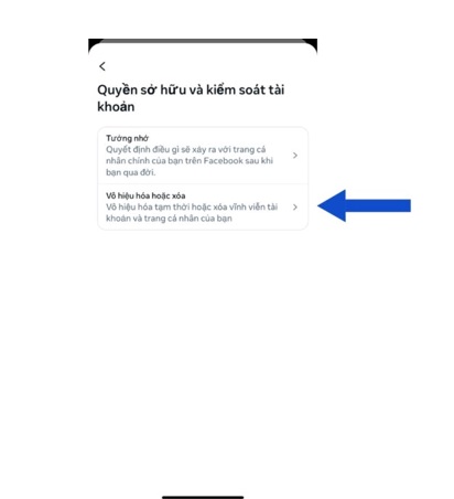 - Bước 3: Bạn nhấn Chọn mục Quyền sở hữu và kiểm soát tài khoản. Sau đó bạn nhấn vào mục Vô hiệu hóa hoặc xóa.