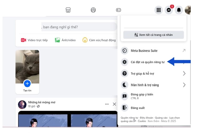 - Bước 1: Bạn nhấn Mở Facebook trên máy tính. Bạn nhấn vào mục ảnh đại diện ở góc trên bên phải. Tiếp sau đó bạn nhấn chọn Cài đặt & quyền riêng tư.