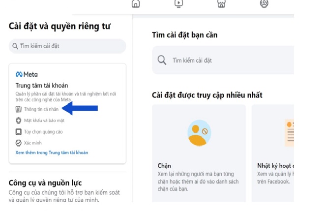 - Bước 2: Bạn bấm vào Chọn mục Cài đặt. Sau đó bạn vào ở mục Thông tin cá nhân.