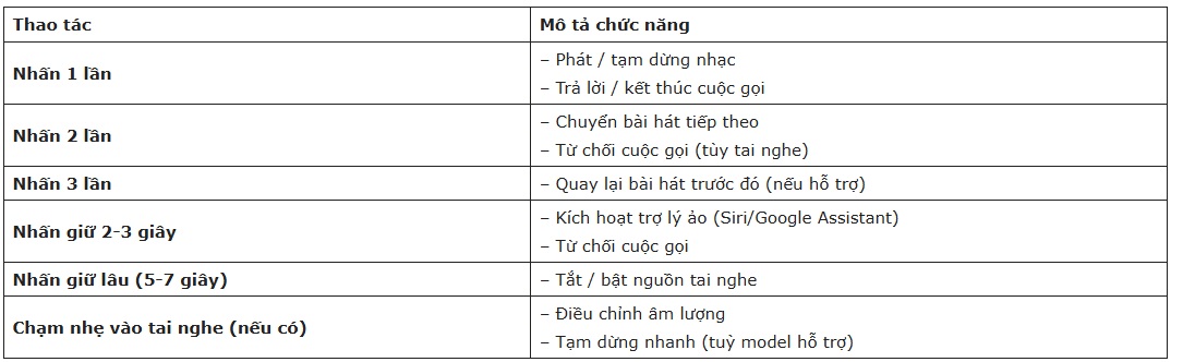 Ở dưới đây là các thao tác phổ biến khi bạn sử dụng tai nghe True Wireless. Chúng rất dễ nhớ và thường có trên hầu hết những mẫu tai nghe ở hiện nay: