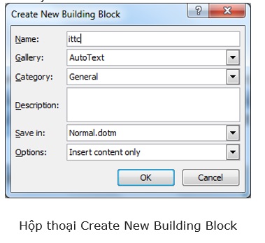- Bước 3: Bạn thực hiện việc điền tên ngắn gọn cho AutoText ở mục tên Name. Bạn bấm vào chọn Gallery là AutoText. Tếp đến nhấn chọn OK để hoàn thành.