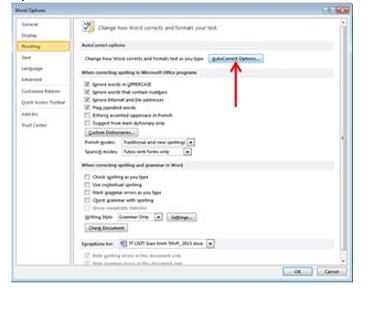 Bước 1: Bạn bấm vào chọn tab File. Bạn nhấn vào chọn Options. Bạn nhấn chọn tiếp Proofing. Rồi bạn nhấn chọn Auto Correct Options.