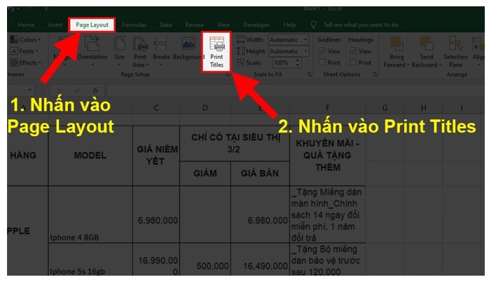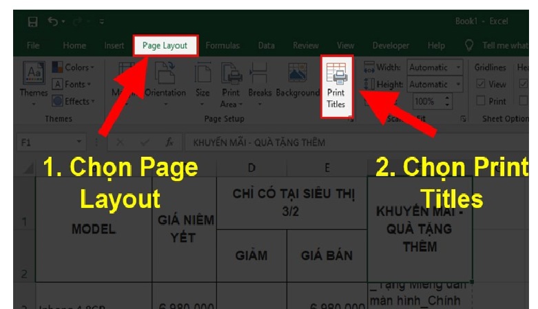 Bước 2: Bạn hãy bấm chọn thẻ Page Layout. Bạn nhấn vào chọn Print Titles.