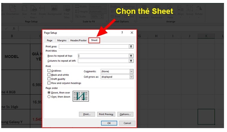 Bước 2: Hộp thoại Page Setup sẽ được hiện lên thì bạn hãy chắc chắn rằng mình đang ở thẻ Sheet.