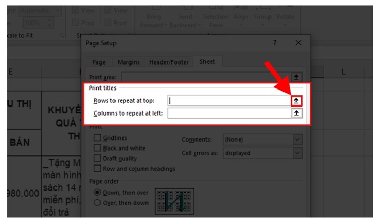Rows to repeat at top: Khi bạn đang muốn thực hiện in lặp lại dòng cho mọi trang (thì hãy áp dụng khi bạn muốn lặp lại những tiêu đề được viết theo hàng ngang nhé).