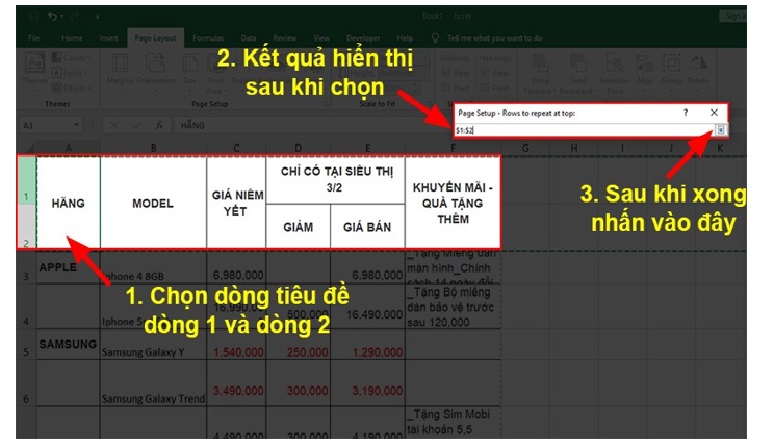 Ở đây thì mình sẽ chọn vào Rows to repeat at top