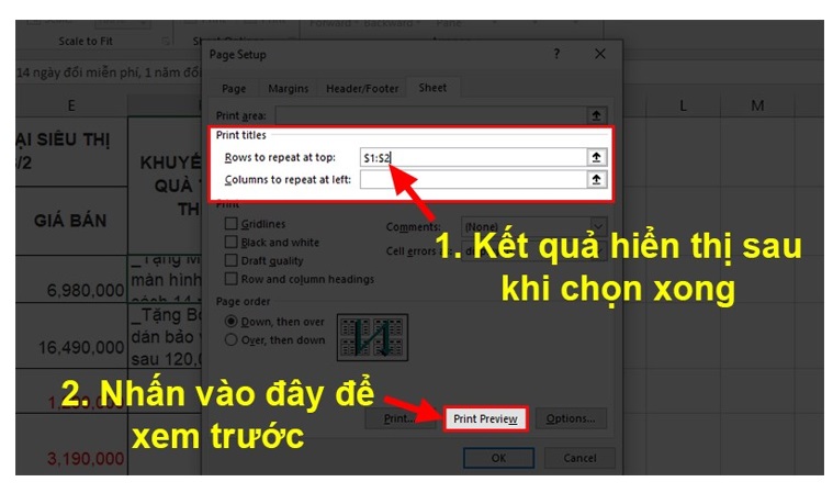 Bước 5: Dòng tiêu đề bạn đã lựa chọn sẽ được xuất hiện ở Rows to repeat at top. Bạn hãy nhấn vào Print Preview để xem trước.